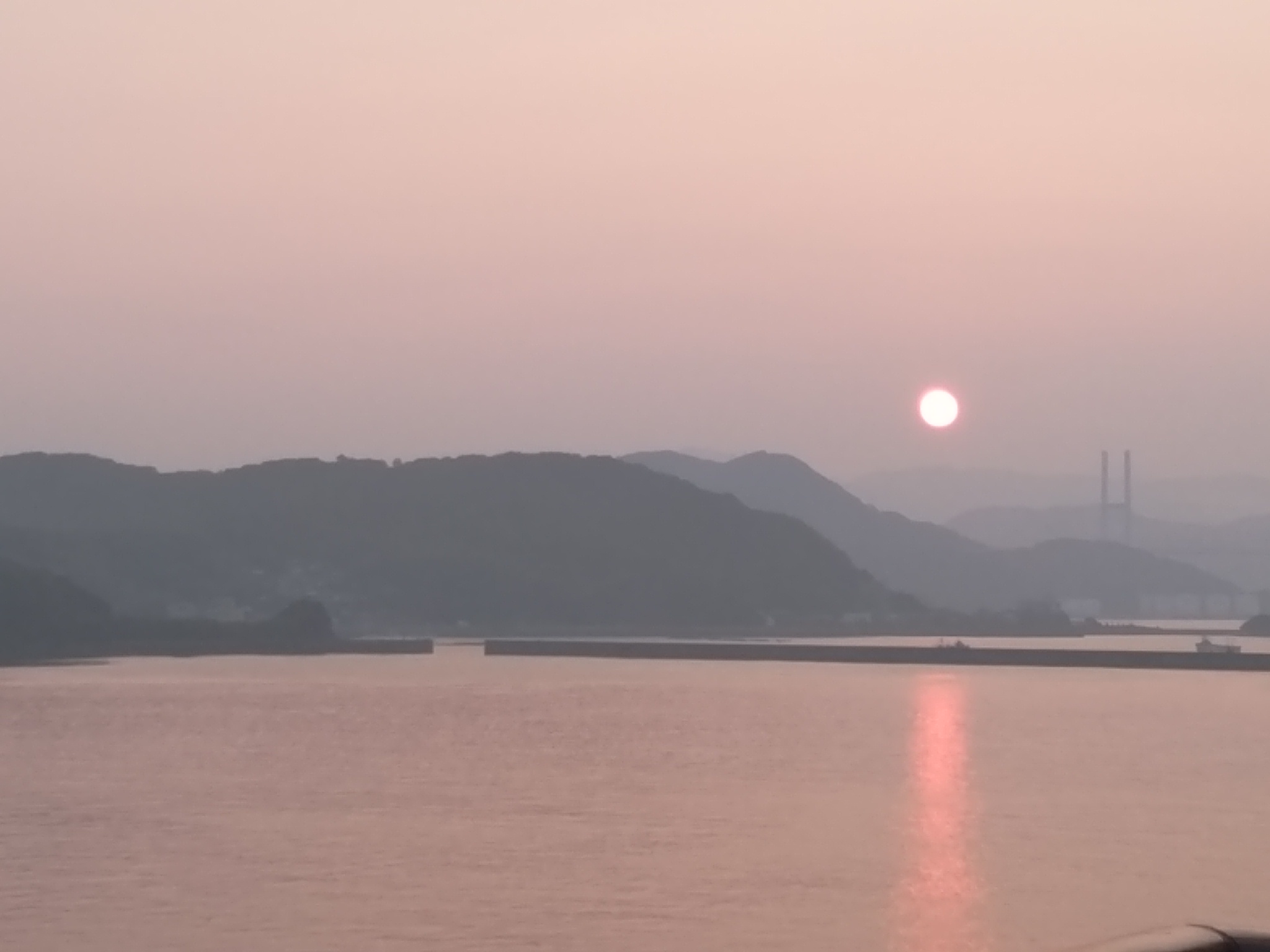 水平線上に空が二層に分かれているような帯状の白いもや。